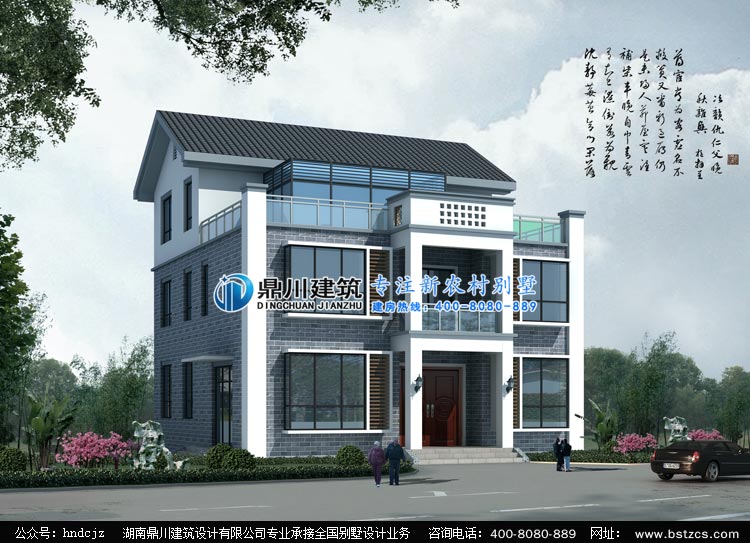 ZH004新中式三層帶露臺別墅圖紙設計外觀效果圖,鼎川建筑中式別墅設計