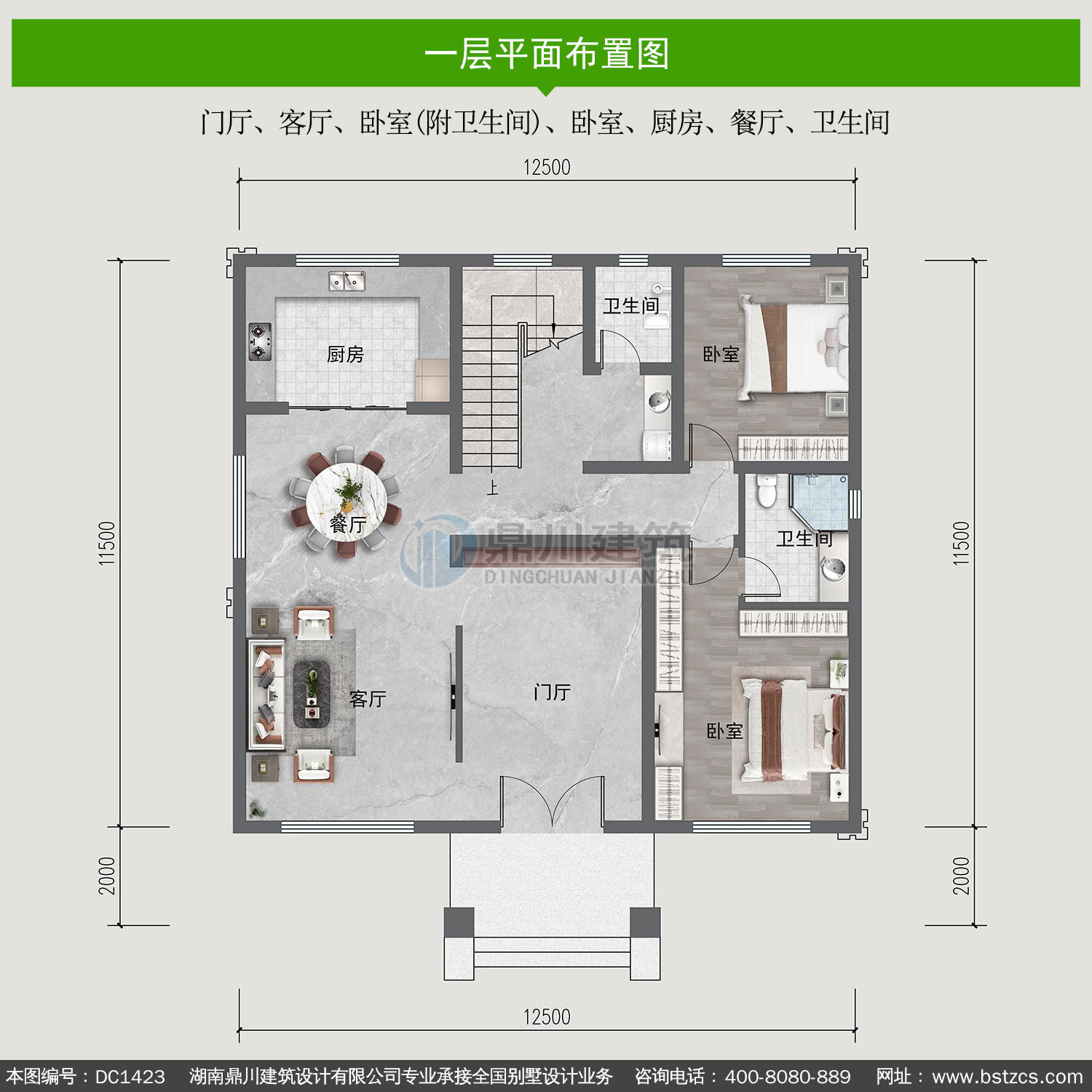 | 一 層: | 門廳、客廳、臥室(附衛生間)、臥室、廚房、餐廳、衛生間 | |||