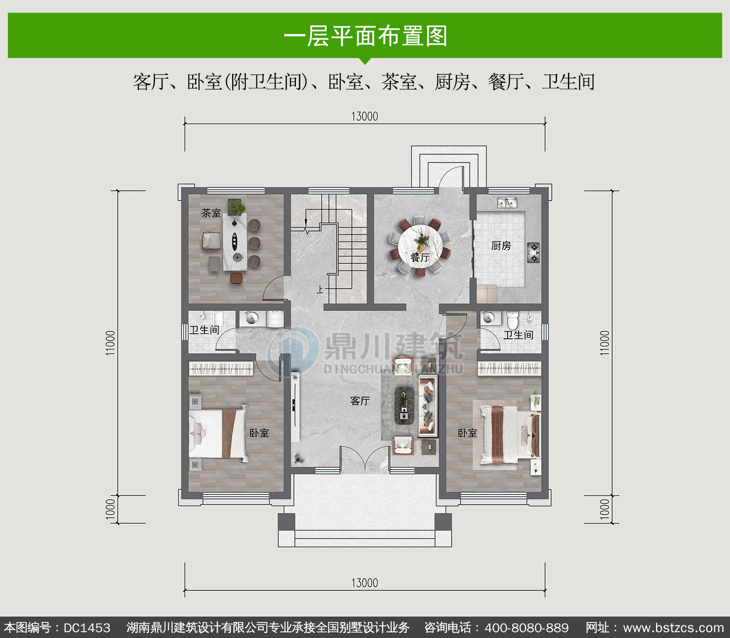 | 一 層: | 客廳、臥室(附衛(wèi)生間)、臥室、茶室、廚房、餐廳、衛(wèi)生間 | |||