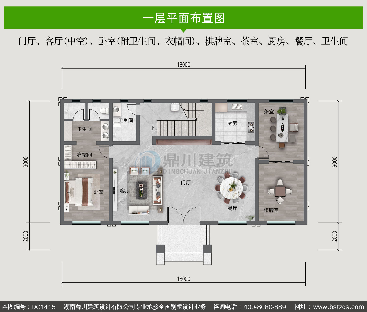 | 一 層: | 門廳、客廳(中空)、臥室(附衛(wèi)生間、衣帽間)、棋牌室、茶室、廚房、餐廳、衛(wèi)生間 | |||
