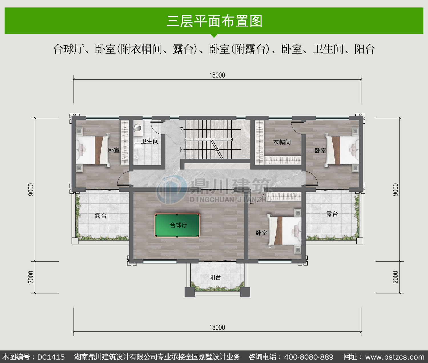 | 三 層: | 臺球廳、臥室(附衣帽間、露臺)、臥室(附露臺)、臥室、衛(wèi)生間、陽臺 | |||